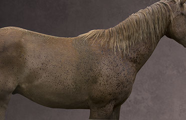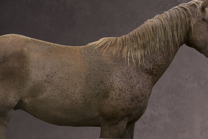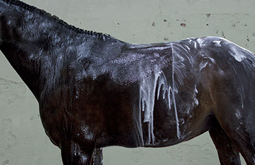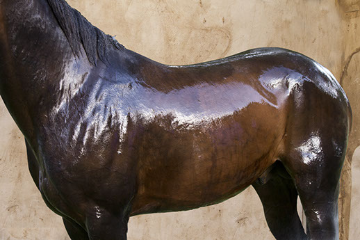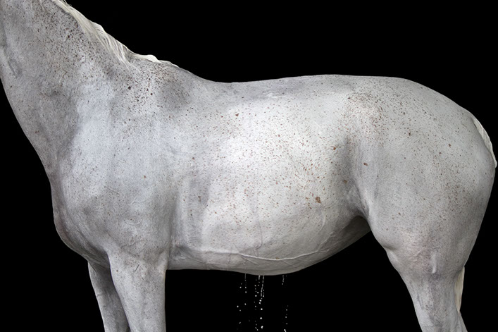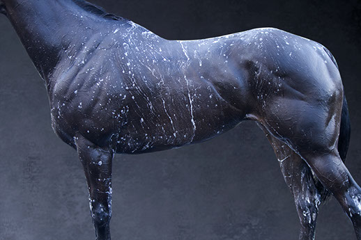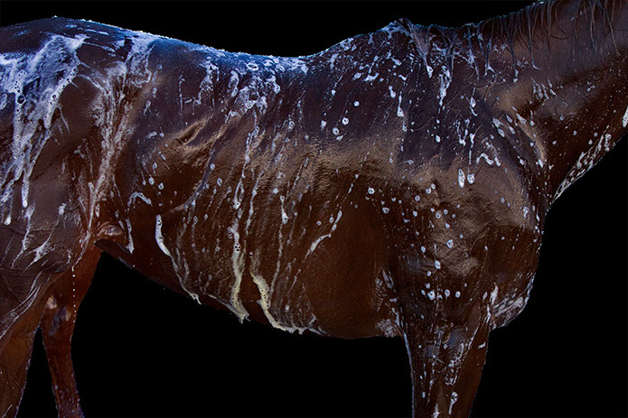 Her artistic eye brings form and time together as she captures these animals in their everyday activities: at the end of race, being bathed, after a gallop. The “torso paintings” allow the viewer to be there in the moment. Not only do the photographs show us what is familiar, but exposes us to what we may not have seen before. These fourteen works of art reveal minute details like the shaved curves of a coat, bouncing drops of water, flecks of hay on a rump, the embedded marks of the stirrups and saddles.