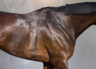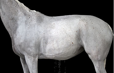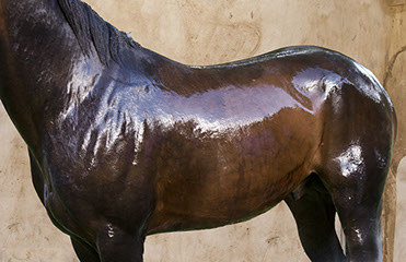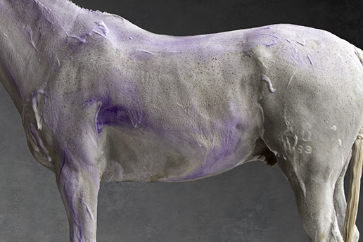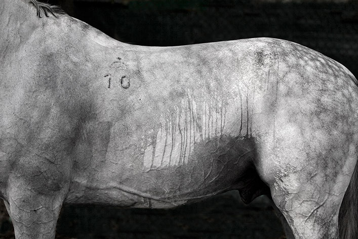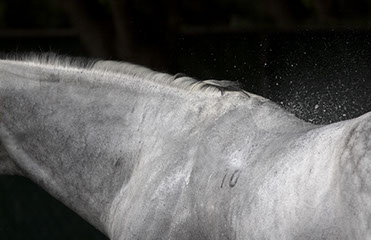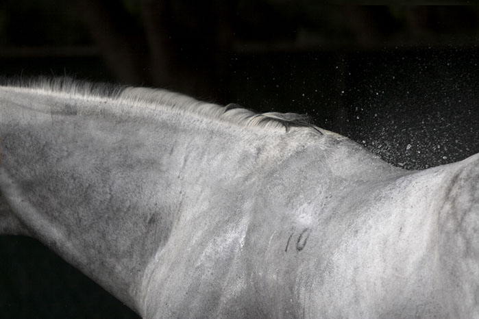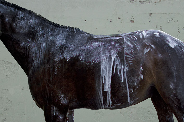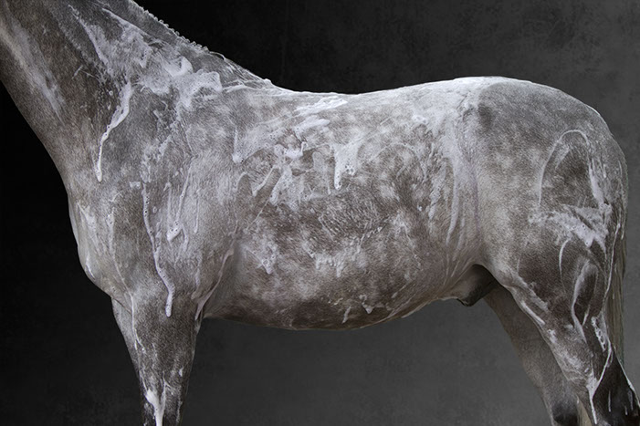 Her artistic eye brings form and time together as she captures these animals in their everyday activities: at the end of race, being bathed, after a gallop. The “torso paintings” allow the viewer to be there in the moment. Not only do the photographs show us what is familiar, but exposes us to what we may not have seen before. These fourteen works of art reveal minute details like the shaved curves of a coat, bouncing drops of water, flecks of hay on a rump, the embedded marks of the stirrups and saddles.